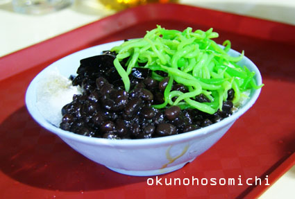 これはカキ氷の上にアズキと仙草という黒いゼリーと、なんだか