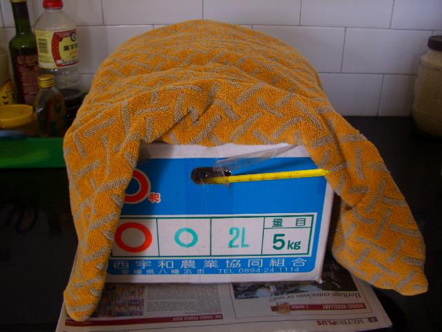 私はこれで発酵を終りにするか、もう少し発酵させたい場合は箱の上に暖めた