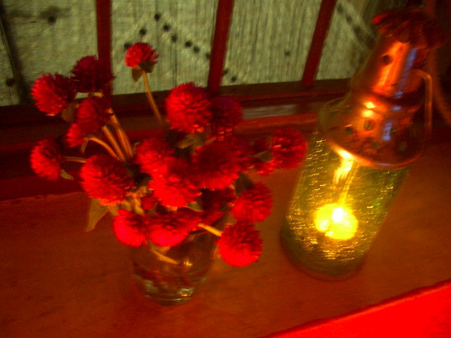玄関先の壁が赤くて、そこにピンクのテーブルがあって、野の花が