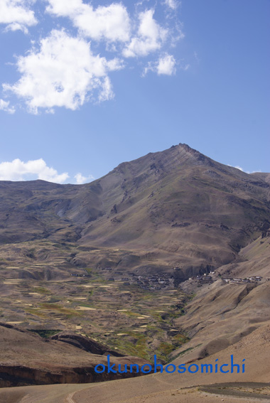 岩と砂でできたような山々に囲まれた、白い壁の家と金色や緑に輝く畑。
