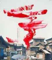 歴史的な建物の写真の上に、ランダムに絵の具をバッと