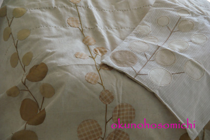 パッチワークのベッドカバーとクッションカバー。(Gramshree)